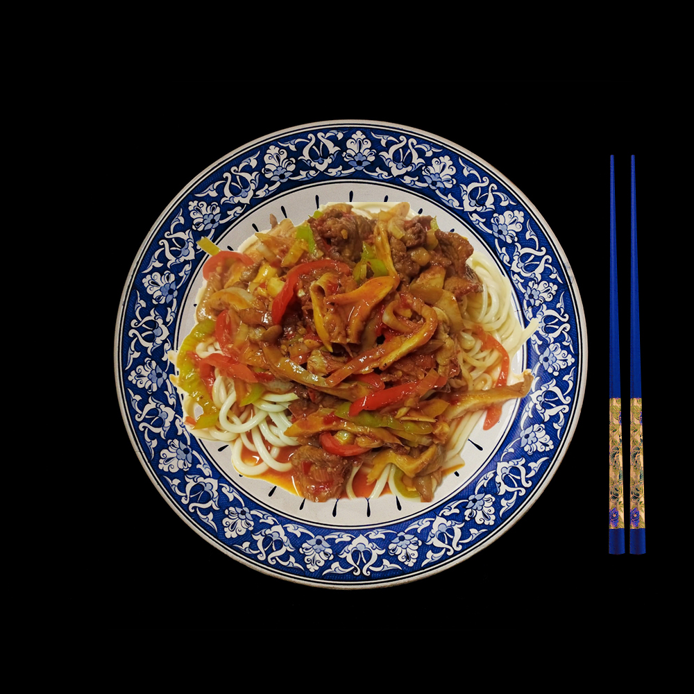 (крупно нарезанное жаренное мясо говядины с тестом, перец красный, зеленый, сельдерей, пекинская капуста)